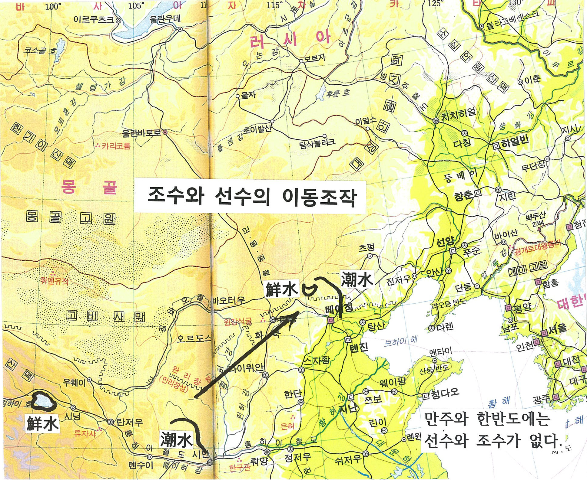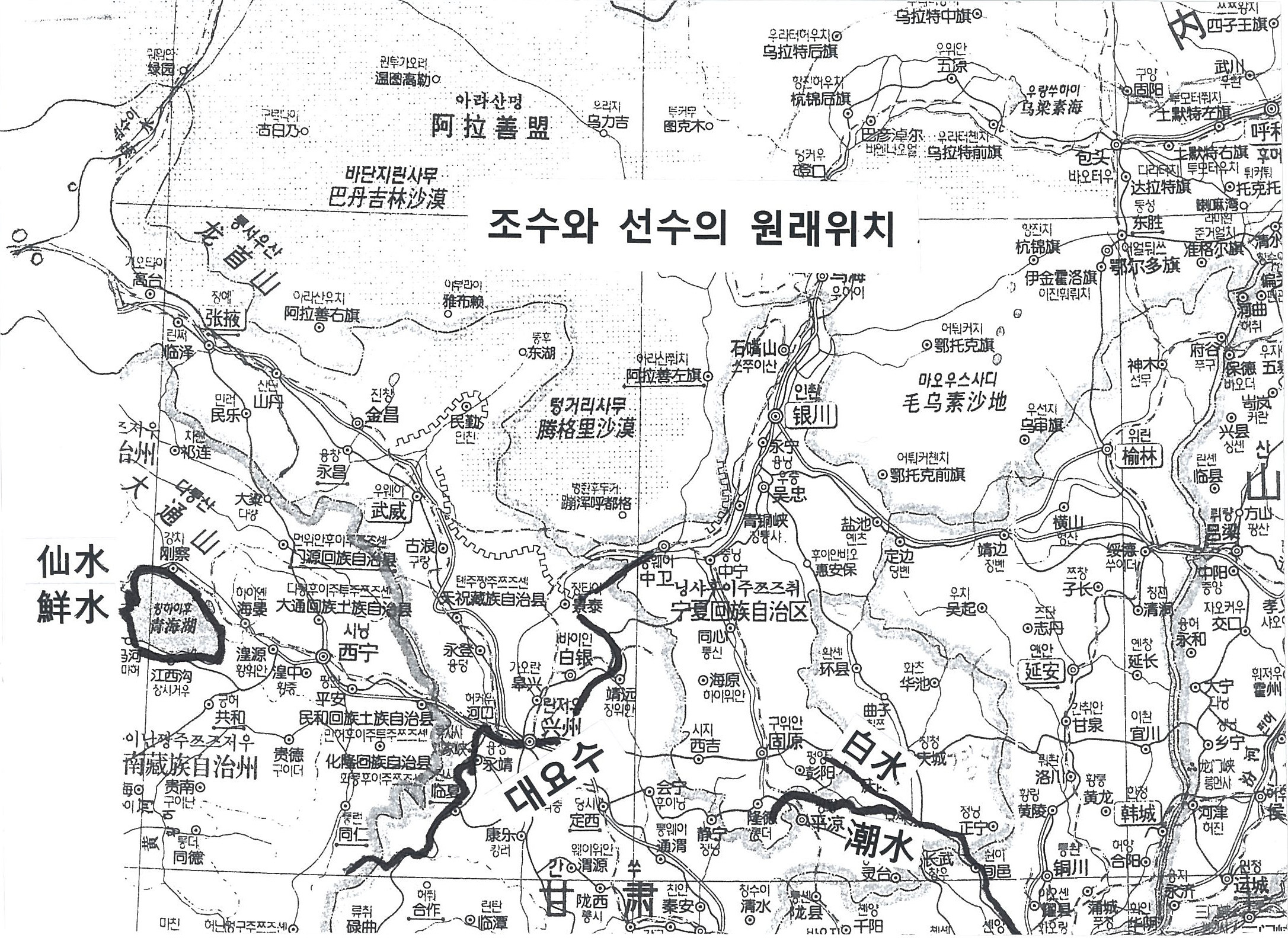 ※선수는 지금 중국청해성 청해호이고, 조수는 지금 중국감숙성 경수(涇水)다. 조수와 선수가 바로 고조선의 광역 안에 있다. 동북3성에서는 조수와 선수가 없으므로 고조선은 만주에 없었다.