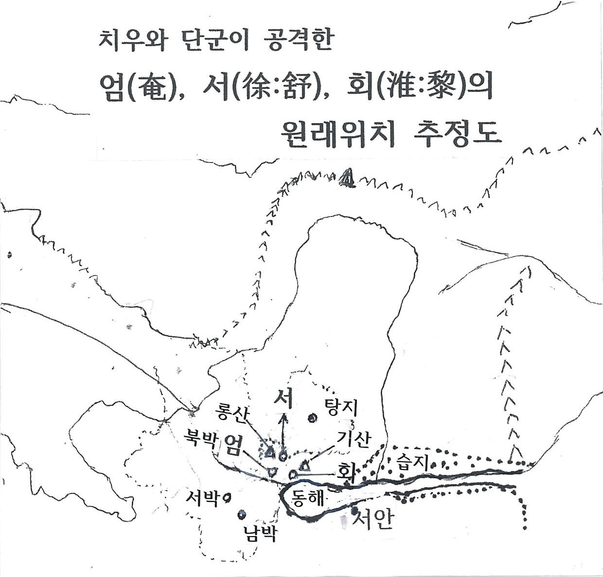 환단고기 해설자들은 모두 엄, 서, 회를 중국 동부인 엄(淹)은 산동성, 서(徐)는 강소성, 회(淮)는 안휘성으로 비정하였는데 이것은 중국의 모든 사서들이 조작되었다는 것을 모른 채 책대로만 연구한 결과이다. 3000년 전의 상고시대에 중국 동부는 바다, 호수, 늪지, 습지가 대부분이어서 국가가 없었다.