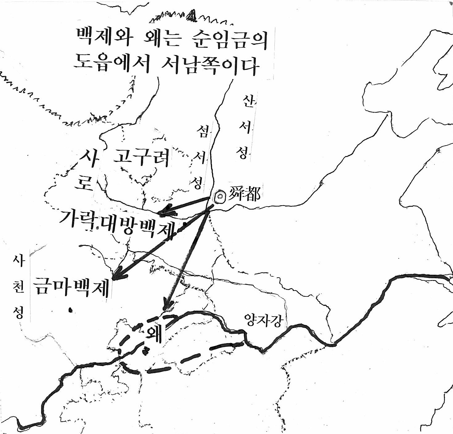 서안 동북쪽 산서성 서남 구석의 영제현(포판)에 있는 순임금 도성에서 비류의 대방백제와 온조의 마한백제는 서남쪽에 있었으며, 왜국은 남쪽이라고도 할 수 있으나 서남쪽이라고 기록되어 있다.