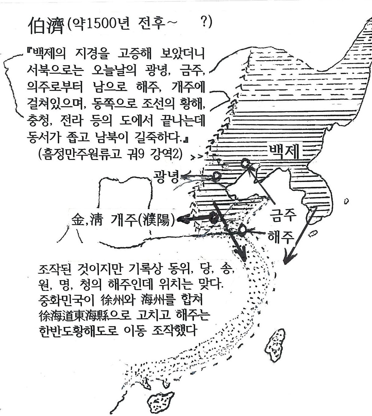 약 1500년 전후에는 중국동부평야, 만주평야, 한반도평야의 바닷물이 빠지고 호수와 습지가 있었으므로 새로운 토지에서 농사가 잘되어 풍작을 이루니 나라가 부강하게 되고 새로운 강자가 등장하게 되었을 것으로 본다. 이때 새로이 등장한 나라가 청나라 역사인 흠정만주원류고에 나오는 백제(伯濟)이다. 백제(伯濟)란 “장자가 다스리는 나라“란 뜻이다. 백제는 고리국을 이어 하북성과 산동성은 물론 중국해변을 따라 남해섬까지 진출한 것으로 추정된다. 이는 중국남부 복건성의 고대언어와 문화풍습들을 조사하면 알 수 있다. 이것이 한국의 진짜역사다.