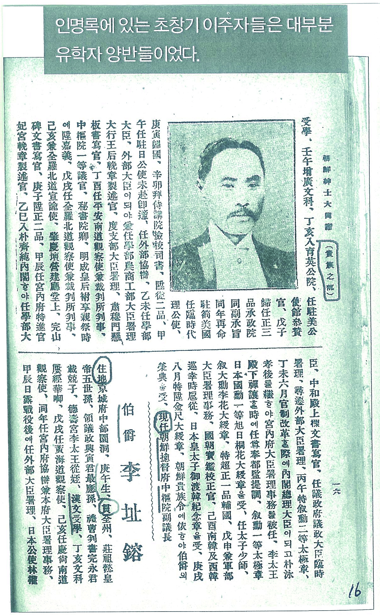 ②이민자 중에서 귀족부 첫머리에 이완용(李完用, 1858~1926), 이지용(李址鎔, 1870~?), 이기용(李埼鎔)---등의 명단이 있다.