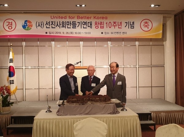 26일 저녁 서울 역삼동 과학기술회관 12층 (SC컨벤션센터)에서 열린 선진사회만들기연대 창립 10주년 기념식에서 민계식 이사장(가운데)과 최종찬 공동대표(왼쪽) 김강정 공동대표(오른쪽)가 축하떡을 자르고 있다.