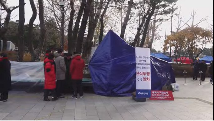 이제 리더십에 대한 의문은 단식 투쟁의 성공 여부와 합쳐져 황 대표를 압박해 오고 있다. 반대 진영에서도 이를 간파했는지 “뜬금없다”느니 “황제 단식”이니 하며 단식을 무위화 시키려 하고 있으며(3) 청와대는 그에게 천막조차 치지 못하게 하여 가로수에 의지하여 만든 움막 속에서 겨울비를 피하고 있다.(사진 참조) 이 처절한 상황을 이낙연 총리가 보고도 방치한 이 사실 하나만으로도 문 정권은 국민으로부터 최고의 비난을 받게 될 것이다.